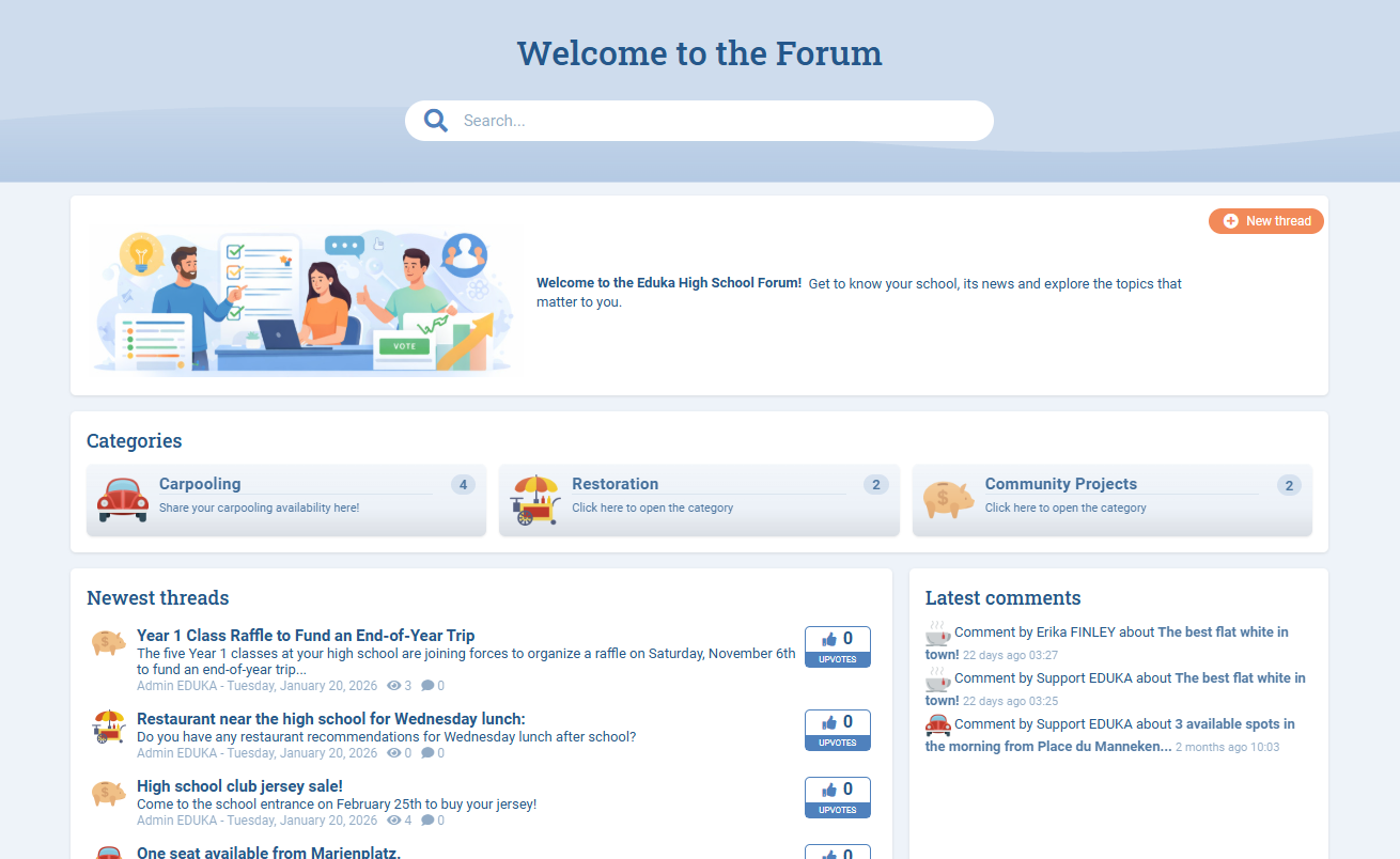 Delivered in a simple and familiar format (categories, discussion threads, replies), it encourages information sharing, peer support and communication between all members of the school community. The module integrates seamlessly into the Eduka ecosystem.
